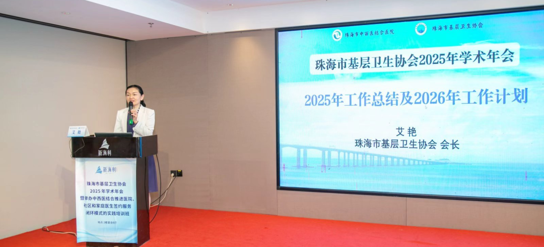 在紧随其后的协会年会中,珠海市基层卫生协会艾艳会长系统回顾了协会在2025年的工作成果,并展望了2026年的发展计划。许鹏飞常务副会长与肖雪萍秘书长则分别就财务运作与评优授牌事宜进行汇报。会议现场对过去一年涌现出的优秀专业委员会进行了表彰,并为新一批家庭医生签约服务培训基地授牌,树立了行业标杆,激发了基层卫生工作者的前行力量。
