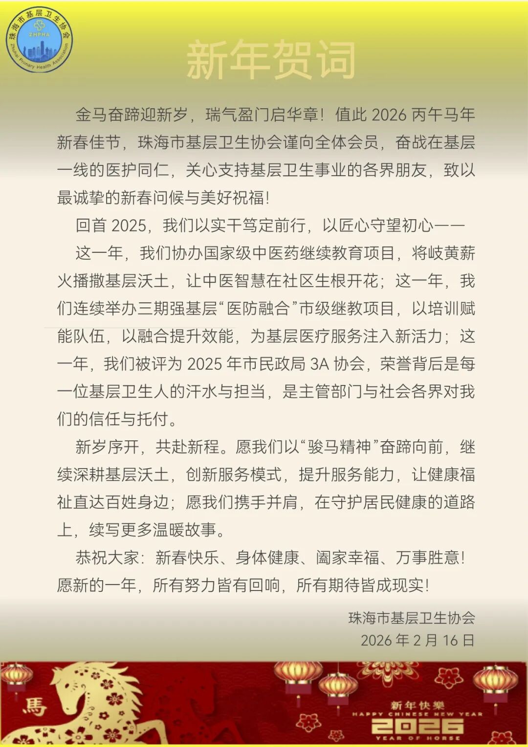 过年好!珠海市基层卫生协会恭祝您马年大吉!